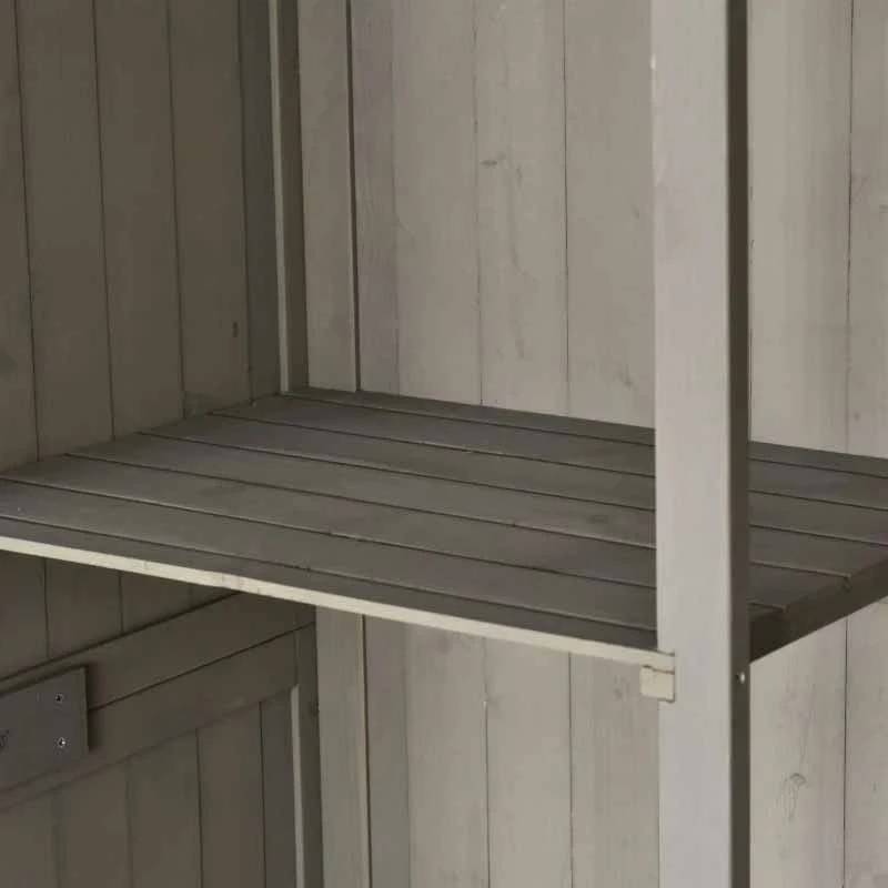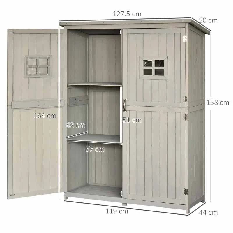 Organize and store your gardening tools and outdoor essentials with this outdoor wooden shed from Outsunny. Made from solid fir wood, this shed offers enduring reliability and strength. The light grey waterproof top coat protects it against mild elements. The tool cabinet features three shelves on the left for storage and a spacious shelf-free area on the right, providing ample space for items of all sizes. This stylish shed is the perfect solution for your garden storage needs.