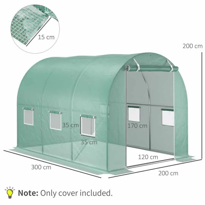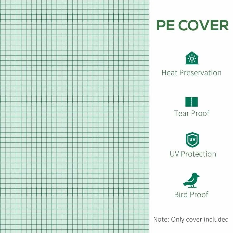 This Outsunny replacement greenhouse cover is made from PE mesh cloth to protect crops from outside weather. It has 6 roll up windows to allow air to circulate inside, and a large zipped door for easy access in and out. The bottom edge extends 20cm all ways, giving room to add weights and keep the cover in place.