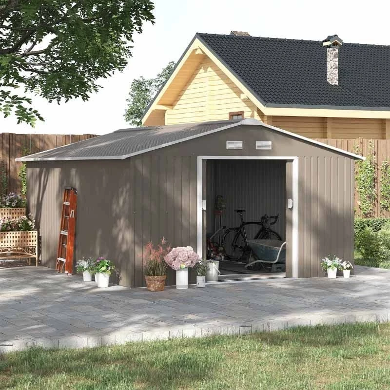 Outsunny 13 x 11ft Metal Storage Shed with Foundation & Doors / Ventilation – Light Grey – 845-031V01LG