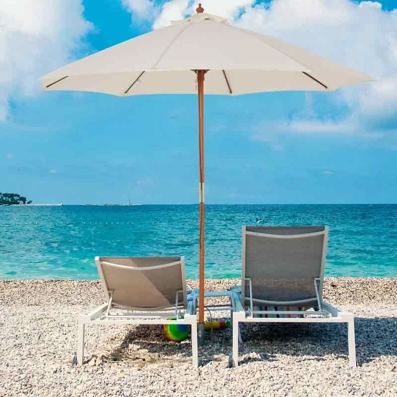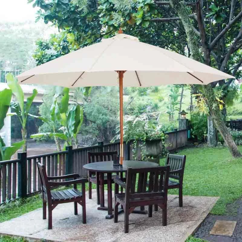 Enjoy the perfect blend of style and functionality with the Outsunny Large Garden Umbrella. Designed to provide shade and protection on sunny days, this parsol umbrella features a polyester canopy with a top vent for improved airflow. The stylish wooden parasol adds a unique touch to any outdoor space, whether it’s a villa, garden, courtyard, or pool area. With its eight ribs and rope pulley mechanism, the umbrella offers stability and easy opening and closing. The off-white color complements various outdoor settings, and the assembly is straightforward. Please note that the parasol base is not included. Enhance your outdoor experience with this practical and stylish umbrella.