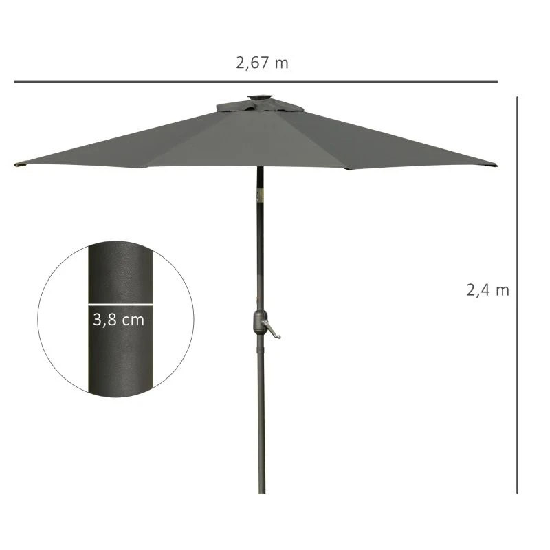Outsunny 2.7m Patio LED Parasol with Push Button Tilt Crank & 8 Rib – Grey – 84D-018CG
