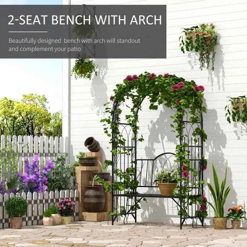 Look no further if you want something special for your garden, this beautifully designed arch garden bench will complement your garden perfectly. Constructed from a powder coated metal frame, this garden bench is durable will last for years to come. Crafted with a design on the side and back rest, this garden bench will certainly be a statement piece of furniture. The wide 2-seater bench is ideal for you and a friend to relax together in the comfort of your own garden. The slatted seat design prevents water build up and circulates air keeping you cool on hot summer days. As stunning as it is, why not grow climbing flowers or vines up the side trellis’s and hang flower baskets along the top bars.