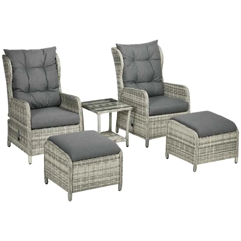 Check out this Outsunny 5-piece rattan garden furniture set with 2 armchairs, 2 foot stools and a small side table that we can be sure will compliment your outdoor living space perfectly. The design mean you can arrange into a position of your liking and tuck the furniture set into a nice corner of your garden making the most out of your space. Constructed from a metal frame and covered in a PE rattan wicker, this garden furniture set is durable, strong and will last for years to come. The extra wide seats, high backs and armrests will keep you and a friend supported and completely comfortable for hours on end. The thick cushions, each have a zip making them easy to remove to wash and maintain yourself at home. The coffee table is light weight so is easily manoeuvred to your preferred position, ideal for resting your drinks and snack bowls and finished off with an elegant glass top. Sit back and relax with the reclining backs with your feet up on the foot stools or use as additional seating to entertain a few others. If you are looking for a stylish and unique design rattan garden furniture set, this is the one for you.