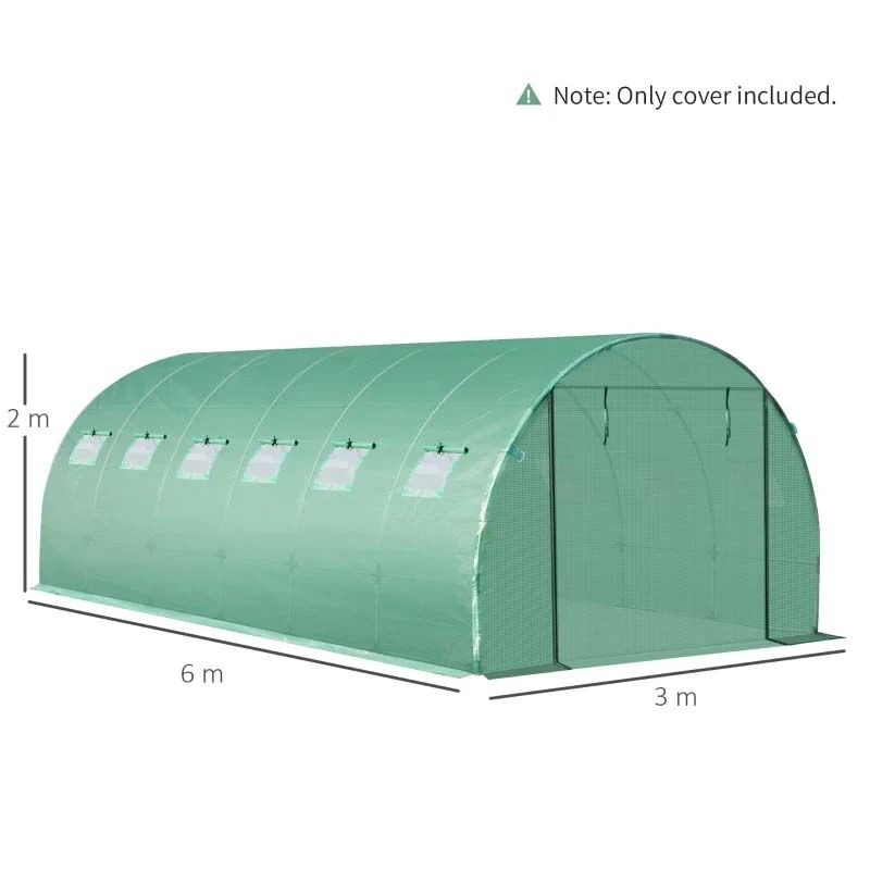 This Outsunny replacement greenhouse cover is made from PE mesh cloth to protect crops from light rain, light wind and direct sunlight. It has 12 roll up windows to allow air to circulate inside, and a large zipped door for easy access in and out. The bottom edge extends 15cm all ways, giving room to add weights and keep the cover in place.