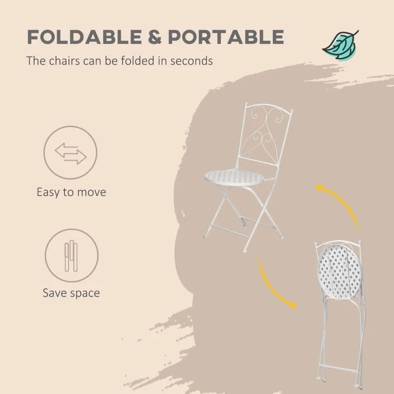 Whether in your garden, as balcony furniture, porche or in your outdoor patio space, this Outsunny 3 piece mosaic bistro set will blend in easily and add a touch of style where it is placed. The chairs and table are foldable making this set easy to move or stoor when not in use.