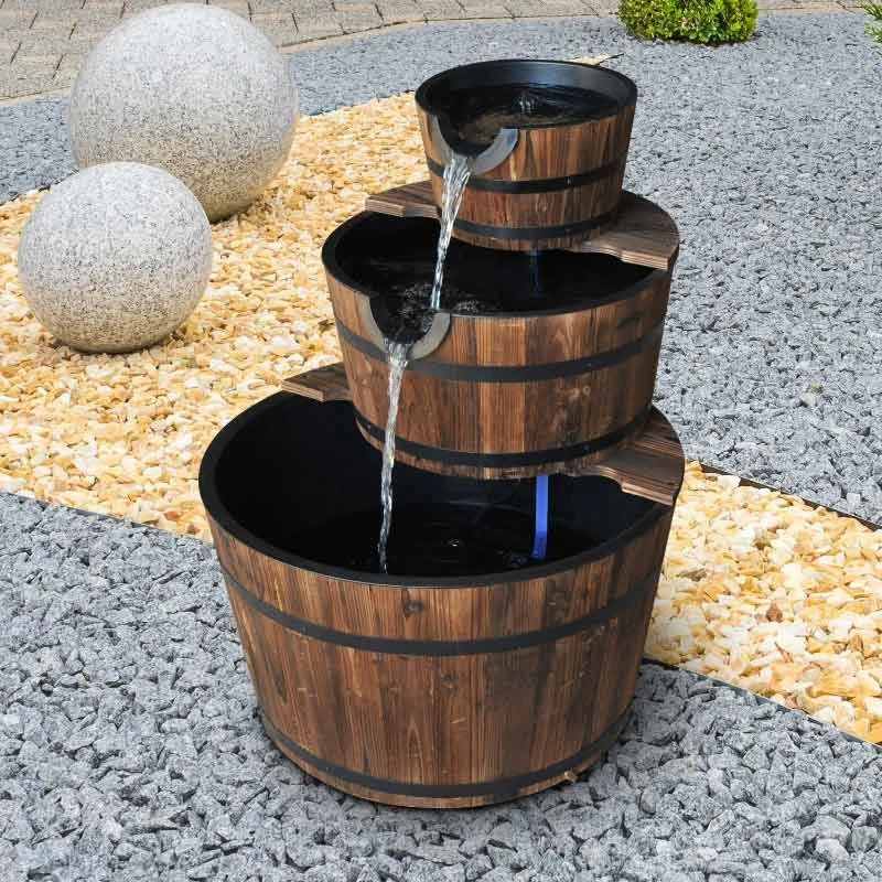 Introduce tranquility and elegance to your garden with the Outsunny 3 tier cascading wooden water feature. Crafted from sturdy fir wood and steel construction, this fountain features a charming 3-tier barrel design that creates cascading waterfalls from the top tier to the bottom barrel. As the water flows from one barrel to the next, it creates a soothing and relaxing ambiance in your outdoor space. The water pump, with a rotate speed of 3600r/min, ensures a steady and continuous flow of water, while the switch allows you to control the water volume. With high-quality construction and CE certification, this water feature is built to last. The power cord, measuring 2 meters in length and equipped with a British standard plug, provides easy and convenient setup.