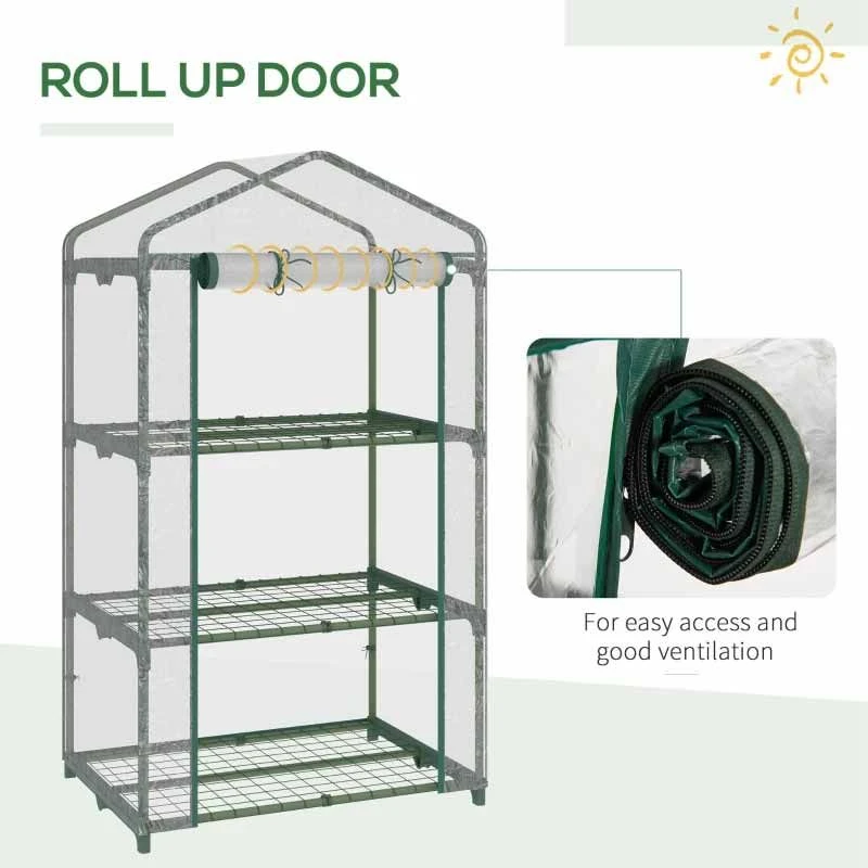 Grow your own produce with this Outsunny 3 tier mini greenhouse. It uses sturdy metal for the frame and a durable plastic cover to protect the plants inside from cold. The roll-up door allows easy access inside and can be fixed in place with fasteners.