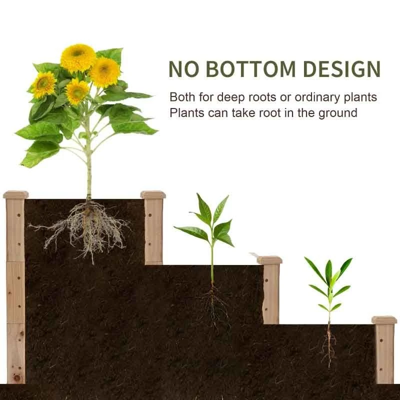 The Outsunny 3 Tier Wooden Raised Garden Planter features three layer structure enabling each plant to be fully exposed to the sun. The three different planting heights meet your different needs for growing deep-rooted plants and regular plants. The elevated garden bed without bottom keeps weeds away from your soil, prevent soil compaction, provide good drainage, and act as a defense against pests. This charming flower bed, which has a natural appearance, is made of solid wood and is durable and sturdy. This product is ideal for growing vegetables, herbs or other plants according to your personal needs.