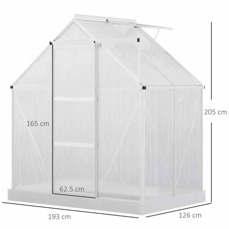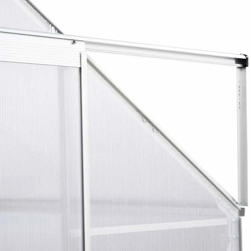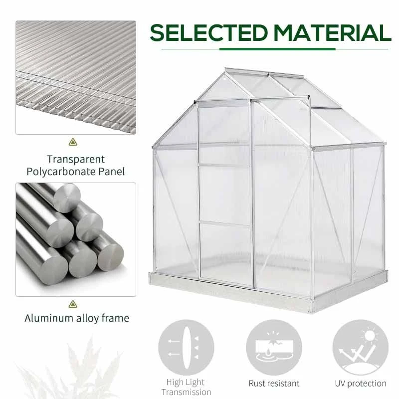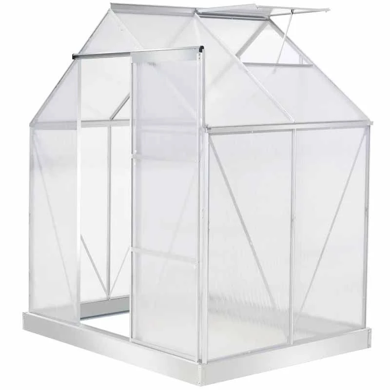 The Outsunny 4x6ft walk-in greenhouse is made of aluminium frame, polycarbonate panels, a sliding front door, and a galvanised steel base for extra strength. It provides plenty of growing room with an aluminium frame, polycarbonate panels, and a small window for ventilation.