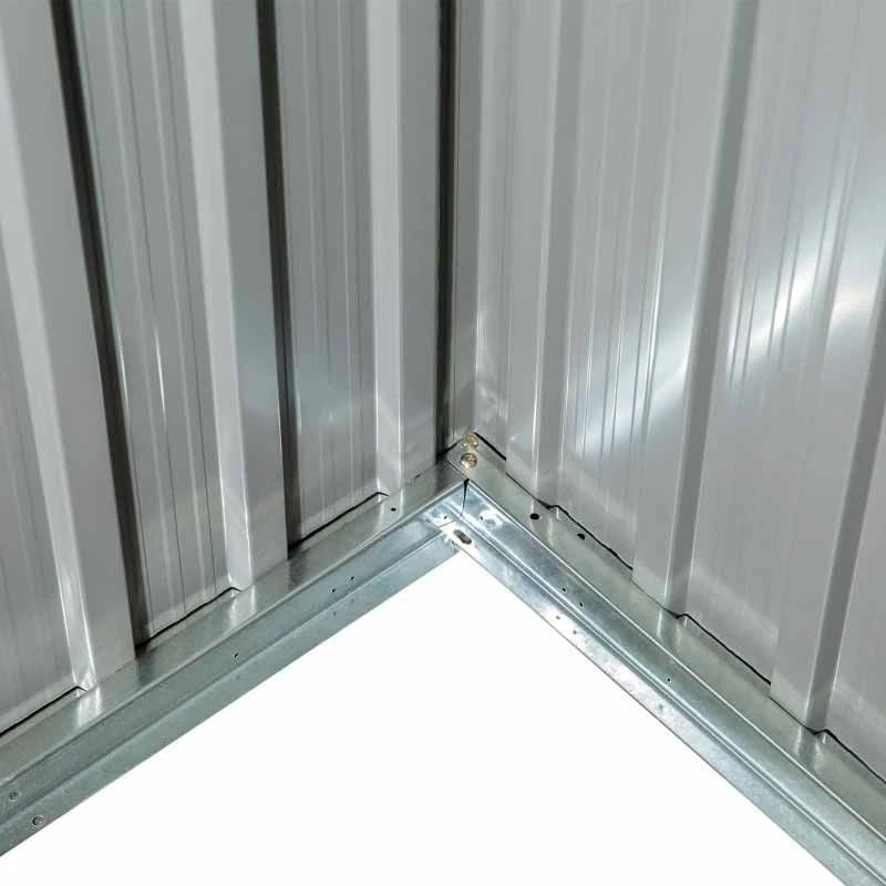 - Sloped roof so water doesn’t build up and rot/rust the frame of metal storage shed