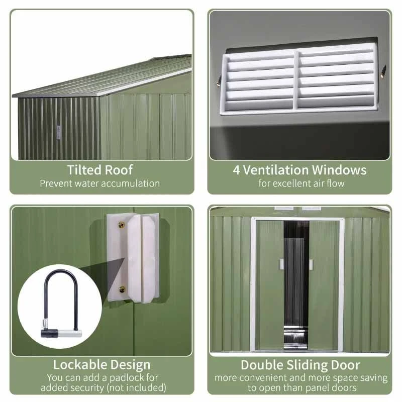 Keep your garden equipment and outdoor essentials securely locked away with this metal garden shed from Outsunny. Crafted from durable colour steel, this shed ensures enduring reliability. The sloped roof design prevents water stagnation and rust formation, while the protective weather coating adds an extra layer of durability. The sliding double doors provide easy access to the spacious interior, making it perfect for storing all your outdoor tools, equipment, and gardening gear. The shed also features four ventilation openings to allow air to pass through, ensuring optimal airflow.