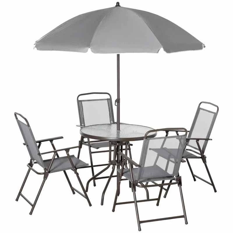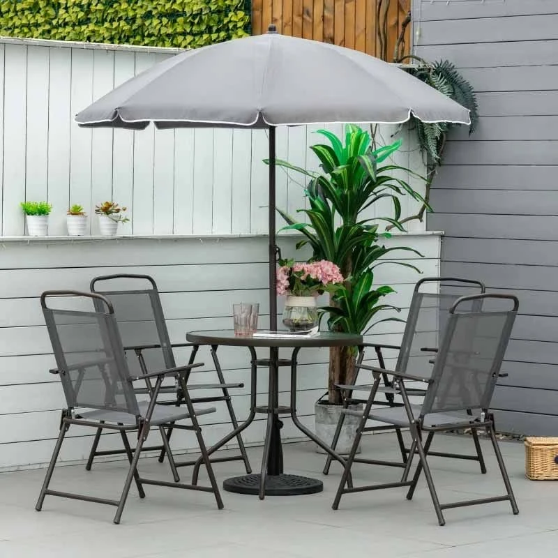 Looking to complete and beautify your outdoor space? Check out this Outsunny dining set. The set includes four foldable chairs, a round glass-top table and parasol umbrella – you’ve got everything you need to dine with family and friends while staying protected from the sun. The metal frames of each piece are strong and rust-resistant, with the breathable mesh chairs making them perfect for hotter climes. An excellent addition to your patio all year round.