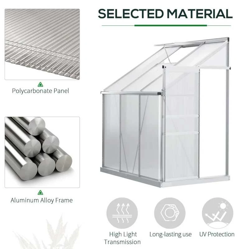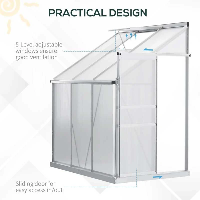 The Outsunny 6 x 4ft lean to greenhouse is a practical grow house with an on-wall design, aluminium frame, polycarbonate panels, built-in side gutters, and transparent finish. It provides a safe and heat-retentive shelter, with built-in side gutters to let rain roll down naturally. The transparent finish of the panels allows natural sunlight to pass through for healthy growth.
