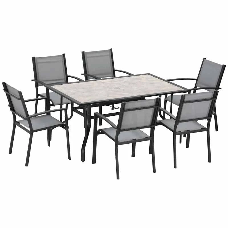 This Outsunny garden dining furniture set will instantly brighten up your garden. This stylish looking set comes with six outdoor chairs and a large dining table. Each chair comes with a mesh panel seat and back for comfort, with high backs and arms for support. The table features a middle hole for a parasol umbrella. This set is made for all season and will surely give you lots of memorable moments.