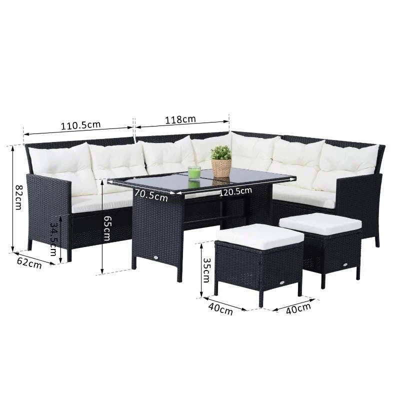 Check out this Outsunny 6-piece rattan garden sofa dining set with 2 sofas, middle chair, 2 foot stools and table that we can be sure will compliment your outdoor living space perfectly. The modern design mean you can tuck the sofa into a nice corner of your garden making the most out of your space. Constructed from a metal frame and covered in a PE rattan wicker, this garden sofa set is durable, strong and will last for years to come. The extra wide seats, high back and arm rests will keep you and a few friends supported and completely comfortable for hours on end. The thick cushions, each have a zip making them easy to remove to wash and maintain yourself at home. The coffee table and ideal for resting your drinks or snack bowls and is lightweight so is easily manoeuvred to your preferred position, even with the glass top finish. Sit back and relax with your feet up with the foot stools or use as additional seating to entertain a few others. If you are looking for a relaxing and modern rattan garden sofa set, this is the one for you.