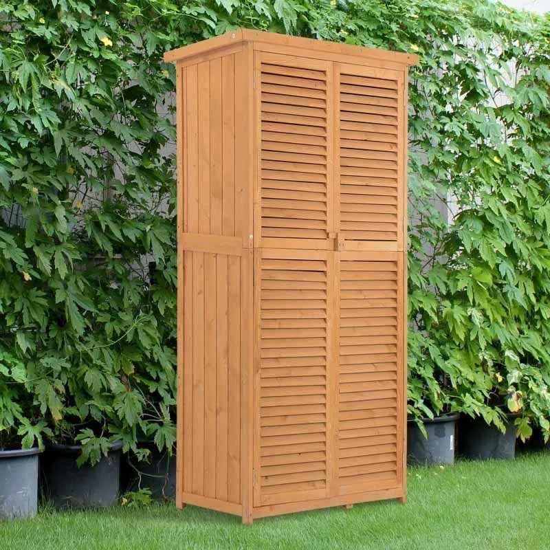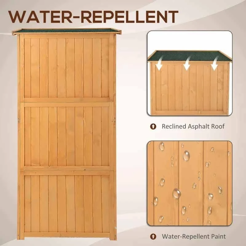 Keep your gardening tools and outdoor essentials organized with this outdoor wood storage shed from Outsunny. Designed with ample storage space, this shed features three shelves at the bottom and a larger space on top. The slanted asphalt roof prevents water pooling and ensures that no water seeps into the tool cabinet. The two wooden doors are equipped with a wooden lock for added security. Get organized in your yard with this practical storage shed.