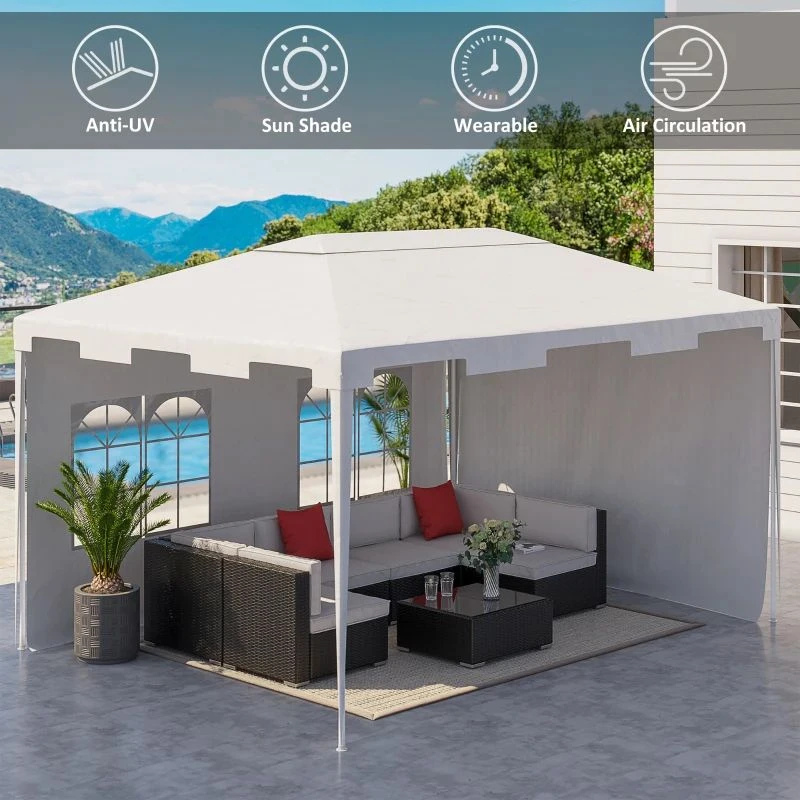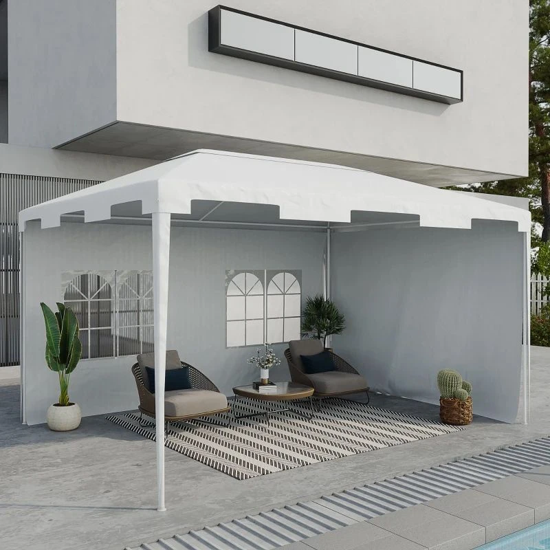 This large Outsunny marquee gazebo with sides is a great item to shelter when entertaining guests. It’s formed of a steel frame for a tough structure, with a durable plastic canopy roof and sides. Four guy ropes and 8 ground pegs are included to pin the party gazebo to the ground for extra stability. This shelter is a fantastic solution for many events such as BBQS, family parties, wedding receptions and more.