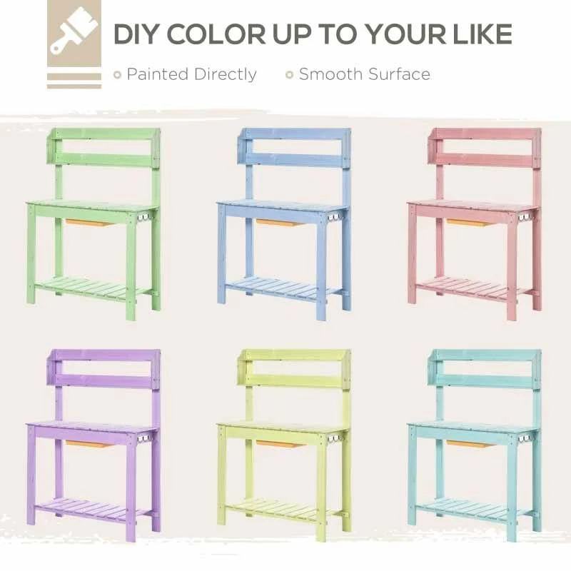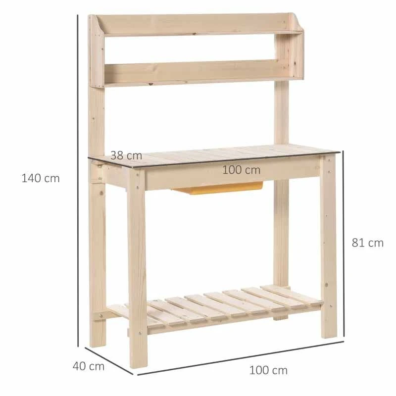 This wooden potting bench from Outsunny boasts durability and toughness, making it suitable for both indoor and outdoor use. The natural finish can be left as is or easily painted to match your style. The bench features two small shelves and a bottom shelf for convenient storage. The expandable worktop provides ample room for maintaining plants and flowers, and it can be easily extended for extra working space. A dry sink is located underneath, perfect for mixing soils or using as a bin. Additionally, the bench is equipped with hooks on the side for hanging equipment within reach.