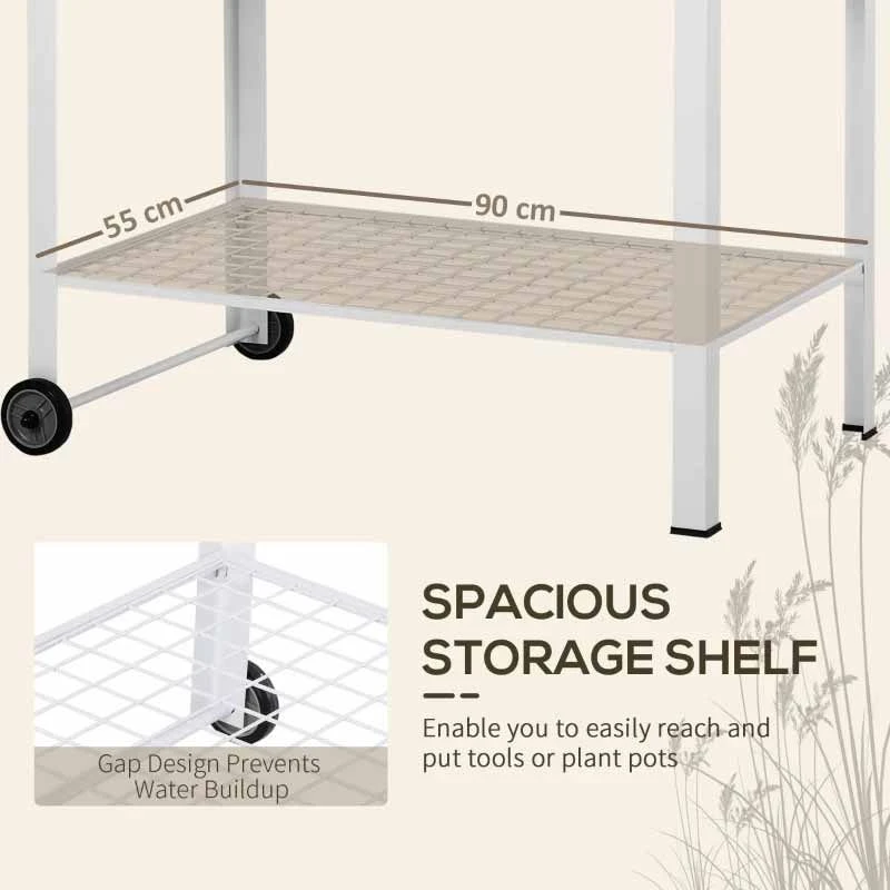 Outsunny Metal Outdoor Garden Potting Table with Wheels – White – 845-316