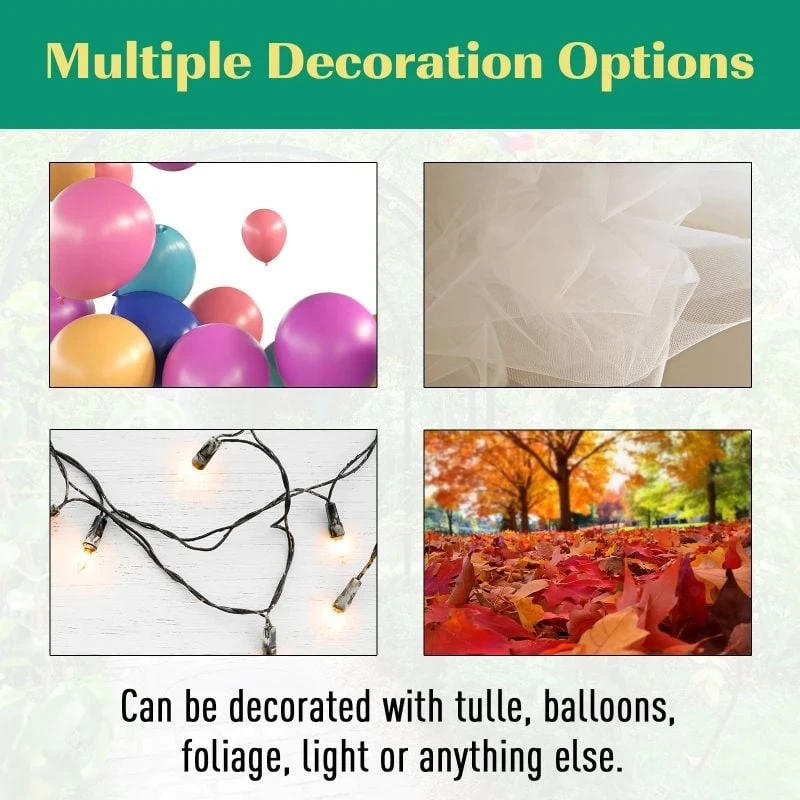 This graceful metal pergola is perfect for various uses such as garden decor, weddings, ceremonies, and other outdoor venues and can be used on both concrete floors and lawns with the ground stake provided.
