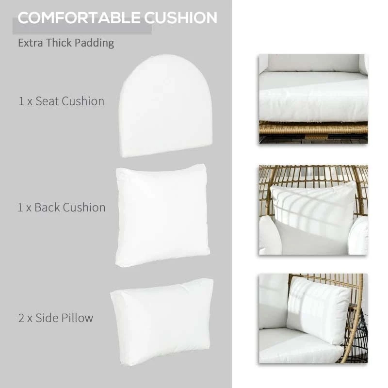 Outsunny PE Round Rattan Egg Chair with Cushions allows you to create the perfect spot in your garden. The wicker wrapped over the frame provides durability, and of course, beautiful style. Fitted with luxurious plush cushions for the seat, back and armrests adding extra comfort. The sturdy steel frame keeps it in shape, with strong four legs for support. The adjustable feet allow you to change the height keeping the chair balanced and steady if the ground is slightly uneven. The chair is suitable for both outdoors and indoors and is easy and safe to store when not in use.