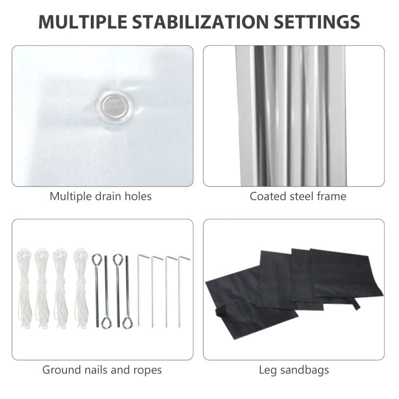 This gazebo comes with guy ropes, ground stakes and four leg-sandbags to mount the garden shelter to soft ground and help your canopy tent resist the wind, whilst the multiple drain holes can effectively prevent water from accumulating on the top.
