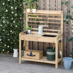 Add exceptional functionality to your garden with this wooden potting bench from Outsunny. Crafted with solid wood, this garden potting bench seamlessly blends into any outdoor setting. It features a convenient and removable sink that can be used for watering or washing purposes, catering to your basic gardening needs. The bench also includes a pull-out metal sieve screen under the panel, allowing you to easily screen sand and gravel. With multiple storage options including a top surface, drawer, bottom shelf, hooks, and hanging baskets, you’ll have plenty of space to organize your gardening tools and supplies. The raised height of the bench ensures easy access to your workstation, reducing strain on your knees and back.