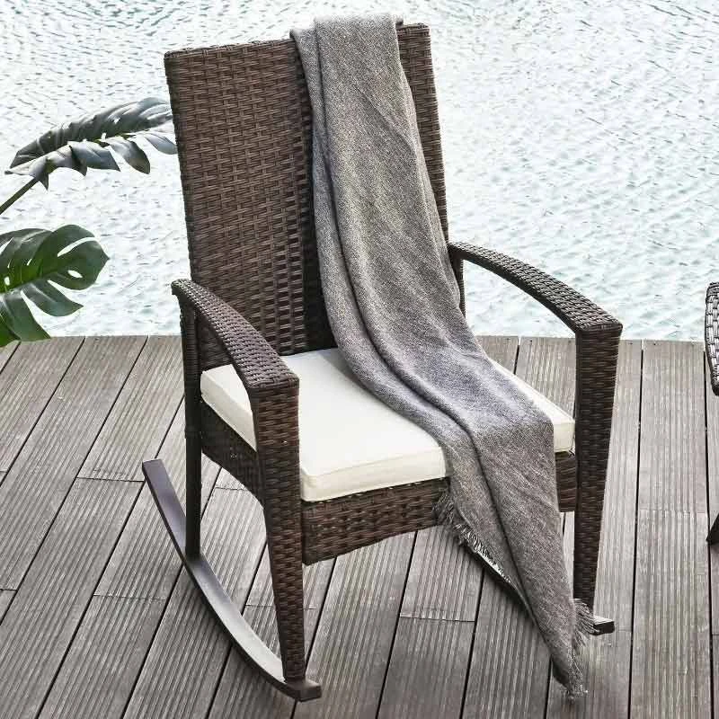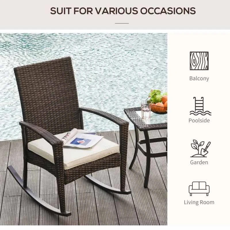 Check out this beautifully designed Outsunny rocker chair. Constructed from a high-quality metal frame wrapped in rattan this garden chair is durable and will withstand the weather elements for years to come. The deep seat, high back and arm rest with a think cushion, we can be sure you will be completely supported and comfortable for hours on end. The curved rocker base will glide you smoothly back and forth for ultimate relaxation. This garden chair is also lightweight so you can manoeuvre easily to a desirable spot of your garden. The modern rattan design will fit in perfectly in any outdoor living space, so sit back and relax with a drink in hand in the comfort of your own garden