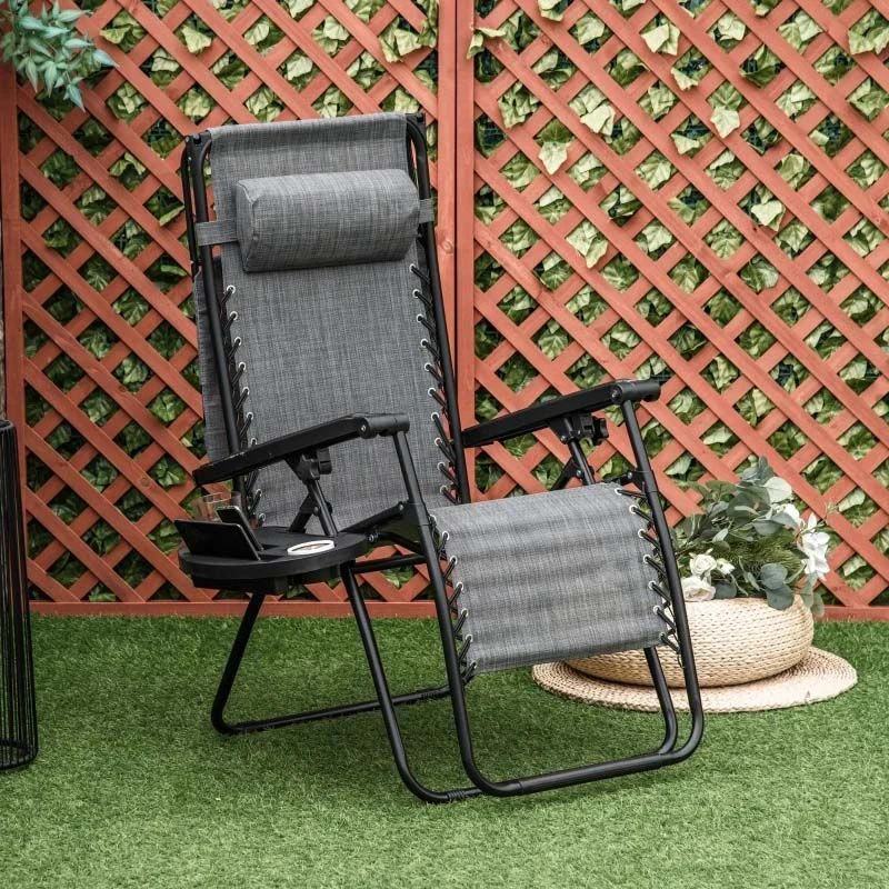 Check out this stunning Outsunny garden sun lounger that we can be sure will compliment your outdoor living space perfectly. Constructed from a powder coated metal frame, plastic arm rests and covered in a sling fabric, the lounger is strong, durable and will last for years to come in the weather elements. The sling fabric circulates air that keeps you cool on warm summer days and can be cleaned with a damp cloth. Sit up to read a book or use the reclining back and footrest function to lay back and relax in the comfort of your own garden for hours on end, complete with the added shade to protect your eyes from the sun and head rest pillow for ultimate support. The handy side table with holes for your drinks, book and phone is ideal for keeping your things close and secure. The folding design allows you to manoeuvre the sun lounger to your preferred position around your garden and is easily packed away when not in use. If you are looking for a beautifully designed sun lounger, this is the one for you.