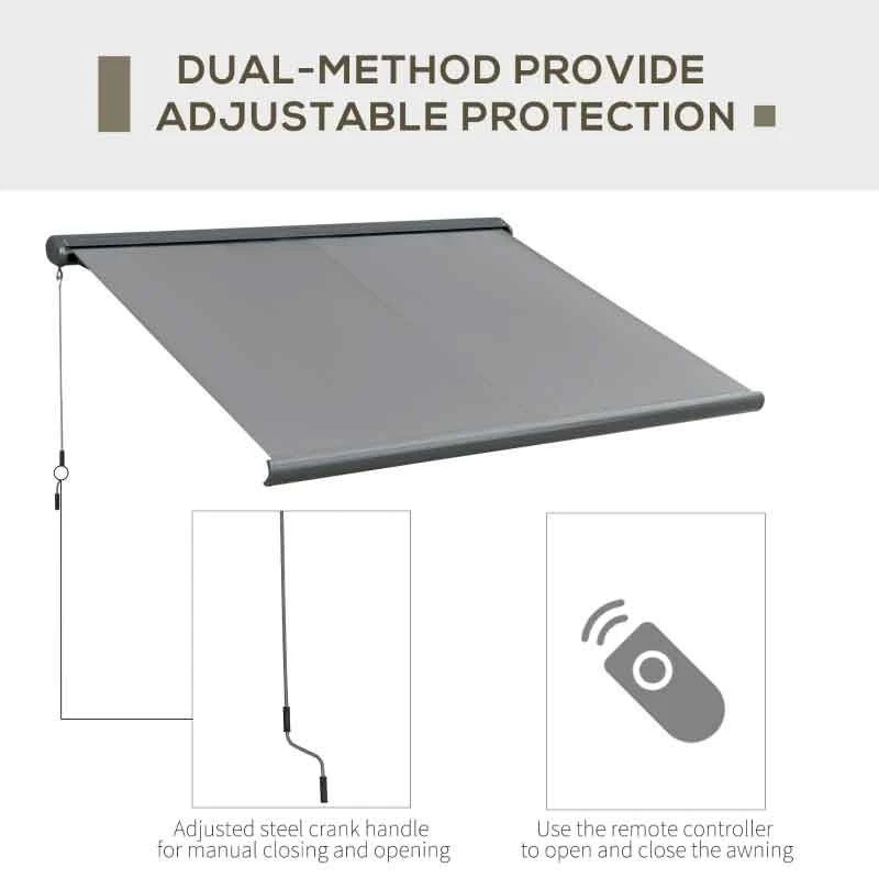 The Outsunny Retractable Manual/Electric LED Strip Awning opens automatically, protecting you from UV rays and the sun glare over your door or window. The hand crank has also been built in for manual operation if needed. Remote control included. The LED Strip has been placed on the supporting arms and is controlled by the remote, creating a warm and ambient glow, perfect for turning on at night. The weather resistant canopy is made from polyester for durability, with a PVC coating and protects you from UV and the sun glaring on you, whilst retaining the colour and condition. The blend of aluminium and steel frame has been designed for reinforced strength and support, all year round.
