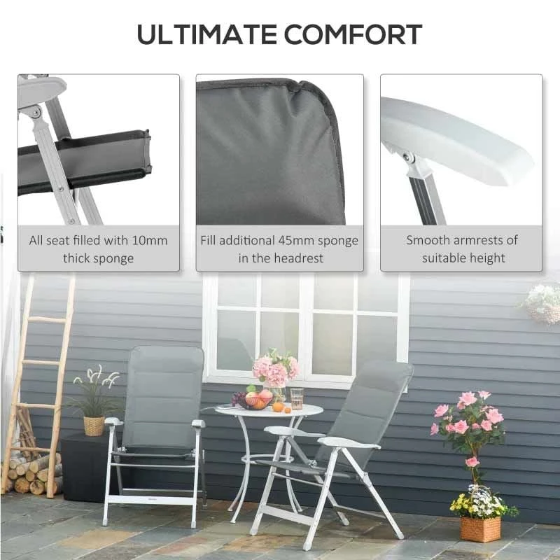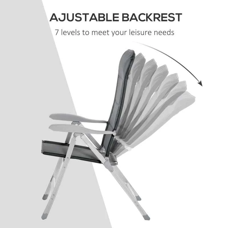 The Outsunny Set of 2 Foldable Padded Garden Chairs is one of the most comfortable additions to your outdoor areas. Foam filled seats and back with extra padding for the headrest to support your upper body. The seven different backrest settings allow you to position to a shape most comfortable to you. The solid aluminum structure holds and supports your body all day long. Curved arms at suitable heights add extra comfort. The chair’s foldable design makes it easy to store and carry with you on trips. Four plastic feet protect your floor from any nasty permanent marks. The Water-resistant PVC cover makes it ideal for camping, fishing, or other sporting events. The chair is durable and easy to clean and maintain.