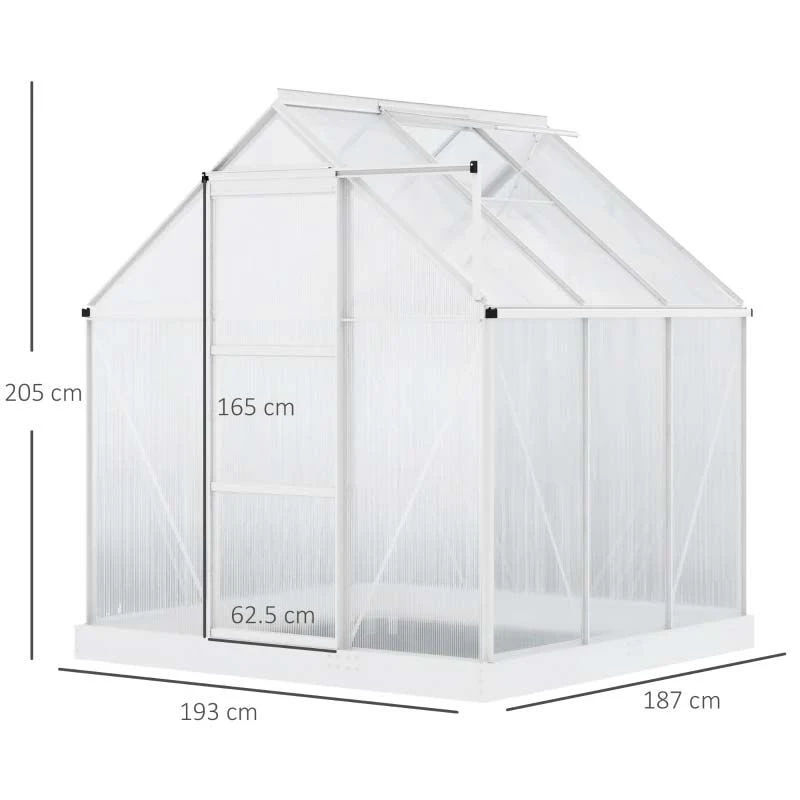 Grow your plants all season with this Outsunny walk in poly greenhouse. It is made of aluminium frame, polycarbonate panels, a sliding front door, and a galvanised steel base for extra strength. It provides plenty of growing room with an aluminium frame, polycarbonate panels, and a small window for ventilation.