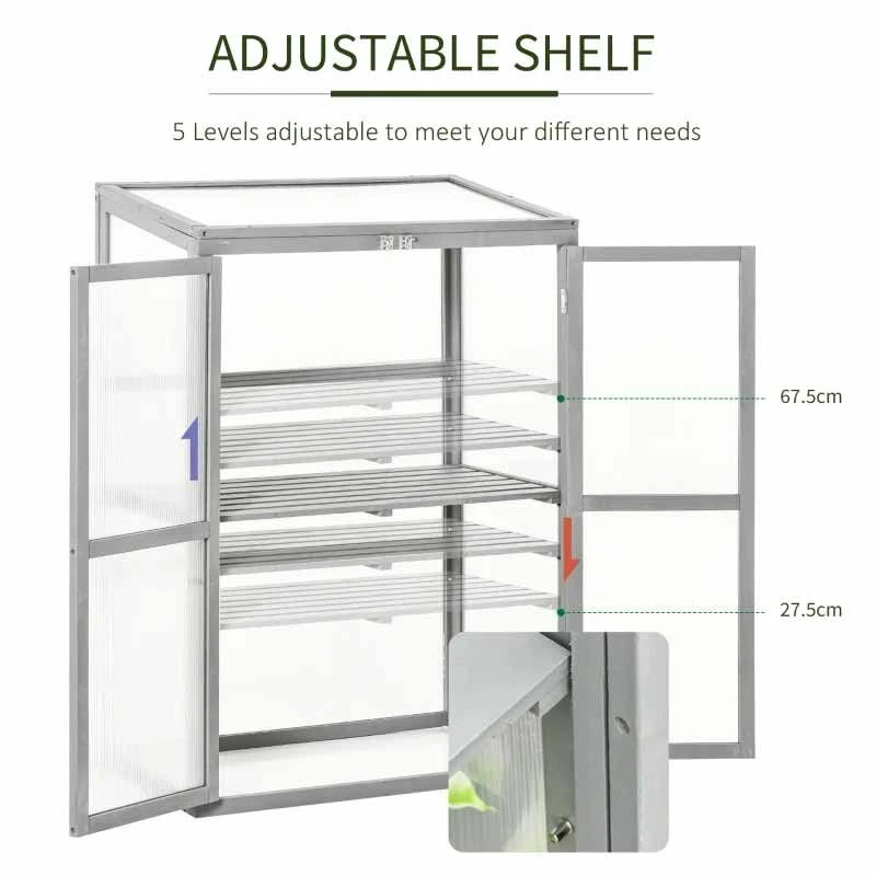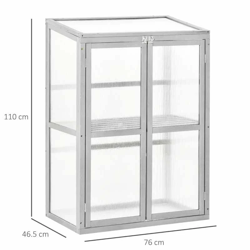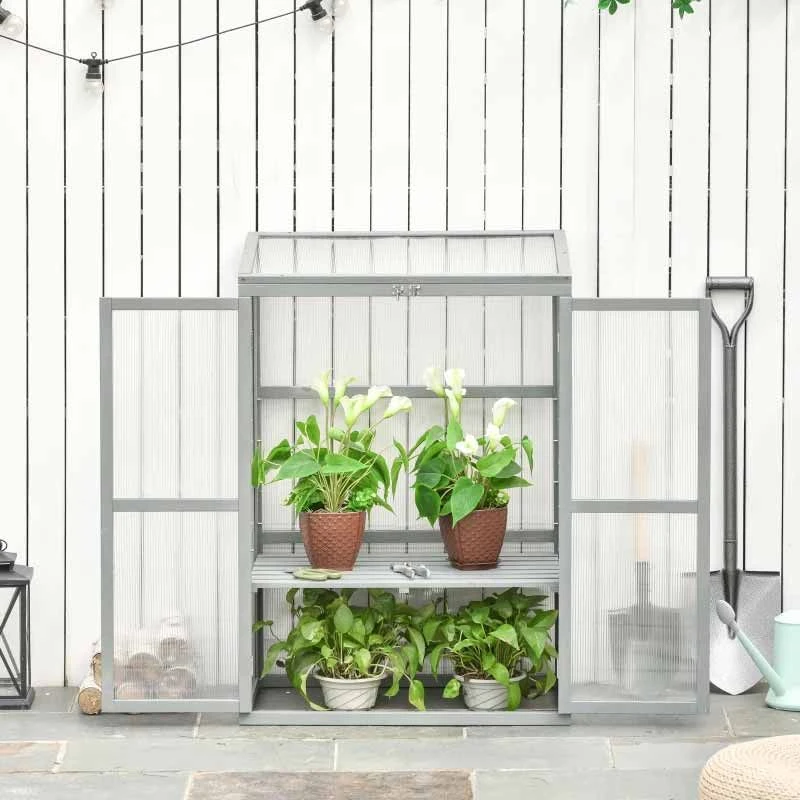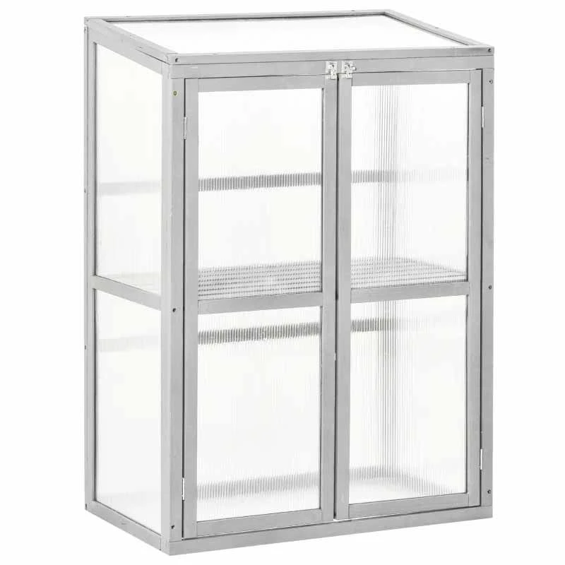 The 1.5 x 2.5ft Outsunny mini wooden cold frame greenhouse uses a wood frame and transparent polycarbonate panels to keep heat inside while allowing the sun to shine through. It features two doors with a latch lock for security and an adjustable middle shelf for more customisable space.