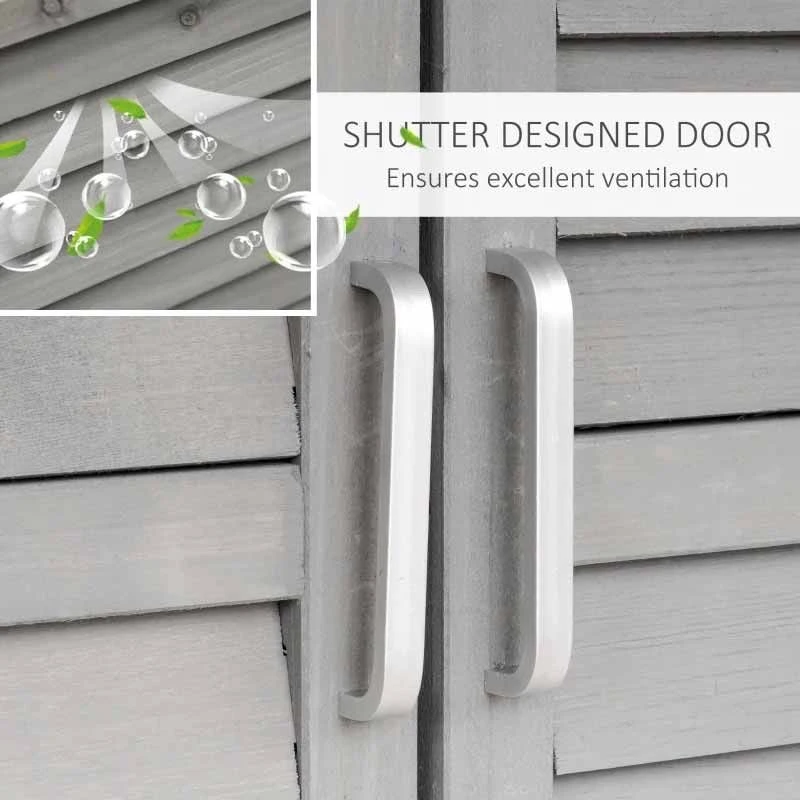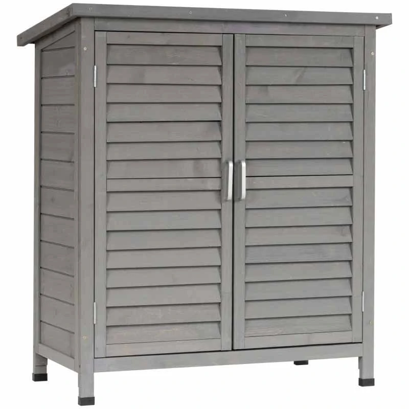 Keep your garden essentials organized and protected with this garden storage cabinet from Outsunny. Made from solid fir wood with a top coat, this storage utility is resistant to stains, water, corrosion, and mildew, ensuring long-term use. The vertical storage shed features two spacious shelves with shutter-style doors that provide ventilation when closed. The tilted roof with a felt top prevents water buildup. This outdoor shed is perfect for storing gardening tools, outerwear, shoes, and more.