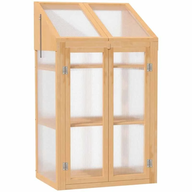 This Outsunny wooden greenhouse is a reliable choice for caring for plants. It features a solid fir wood frame, transparent polycarbonate panels for maximum light transmission, and three removable shelves for organising plants. It creates an ideal-temperature environment, allowing plants to grow healthily.
