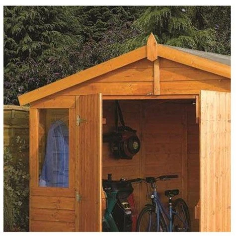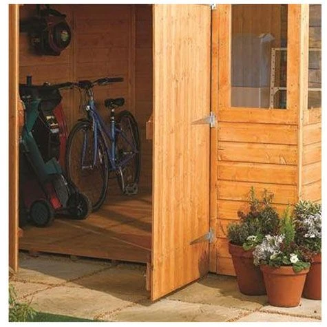 The workshop is manufactured with high eaves for extra headroom, and a solid board roof with mineral roofing felt. There are double doors for easy access secured with a lock and key, styrene glazed windows (the front two windows are fixed), and the wood is finished in a dipped honey-brown colour. Add to that the Shiplap cladding and tongue and groove floor and you’ve got a place stylish enough to look good in any garden.