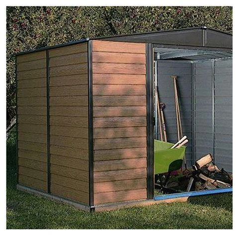 The Rowlinson Woodvale Metal Shed 10 x 12 is a coffee coloured shiplap-look metal shed with a large door opening for easy access. Woodvale Metal Sheds provide a safe and secure area to store your gardening tools or outdoor furniture. This attractive metal shed enhances the look and function or any garden.